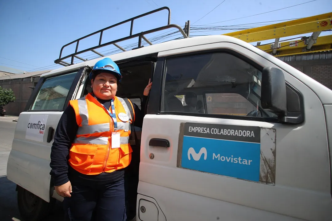 Rosario Tapullima, técnica de telecomunicaciones en Lari, empresa colaboradora de Movistar, realiza provisión de fibra y trabajos de cableado en Lima. «Este trabajo me ha permitido desarrollarme profesionalmente y mantener a mi familia. Ingresé al sector gracias a la recomendación de un conocido y, desde entonces, he aprendido mucho sobre telecomunicaciones», señala.